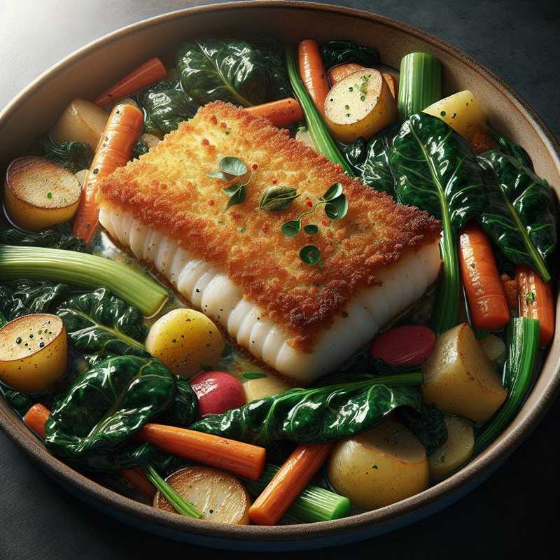 Oven-baked Breaded Cod with Swiss Chard, Potatoes, and Carrots