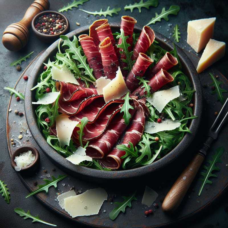 La bresaola è una carne bovina essiccata e stagionata tipica della Valtellina, una valle alpina della Lombardia. È apprezzata per il suo sapore delicato e la sua bassa quantità di grassi. L’abbinamento con la rucola e il parmigiano-reggiano ne esalta il gusto grazie al contrasto tra la dolcezza e la leggera piccantezza della rucola e la sapidità distintiva del parmigiano.
