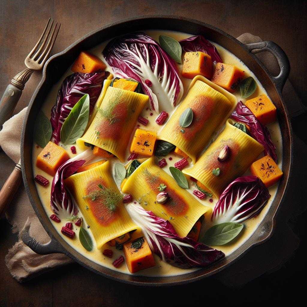 I cannelloni sono un formato di pasta tipicamente italiano, particolarmente amato per la sua capacità di accogliere i più svariati ripieni. La zucca e il radicchio si sposano perfettamente per un contrasto dolce-amaro molto caratteristico della cucina autunnale e invernale del nord Italia, specialmente in Veneto dove il radicchio rosso di Treviso è protagonista di molte preparazioni tradizionali.