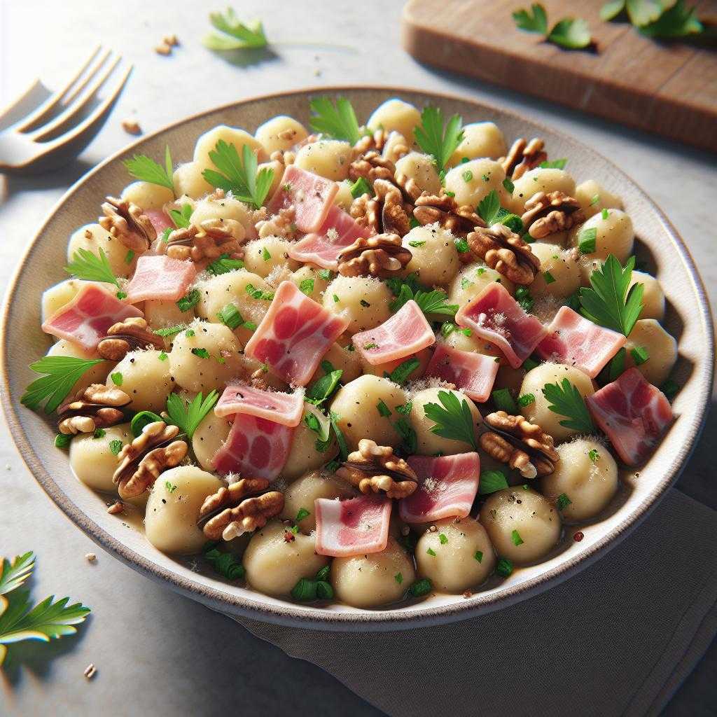Gli gnocchi sono un piatto molto versatile che si presta a numerose varianti. La ricetta che ti ho proposto abbraccia sapori tipici del Trentino-Alto Adige grazie allo speck, un prosciutto crudo affumicato tipico di questa regione. L’abbinamento con le noci e il prezzemolo aggiunge una nota croccante e fresca che bilancia il gusto deciso dello speck.