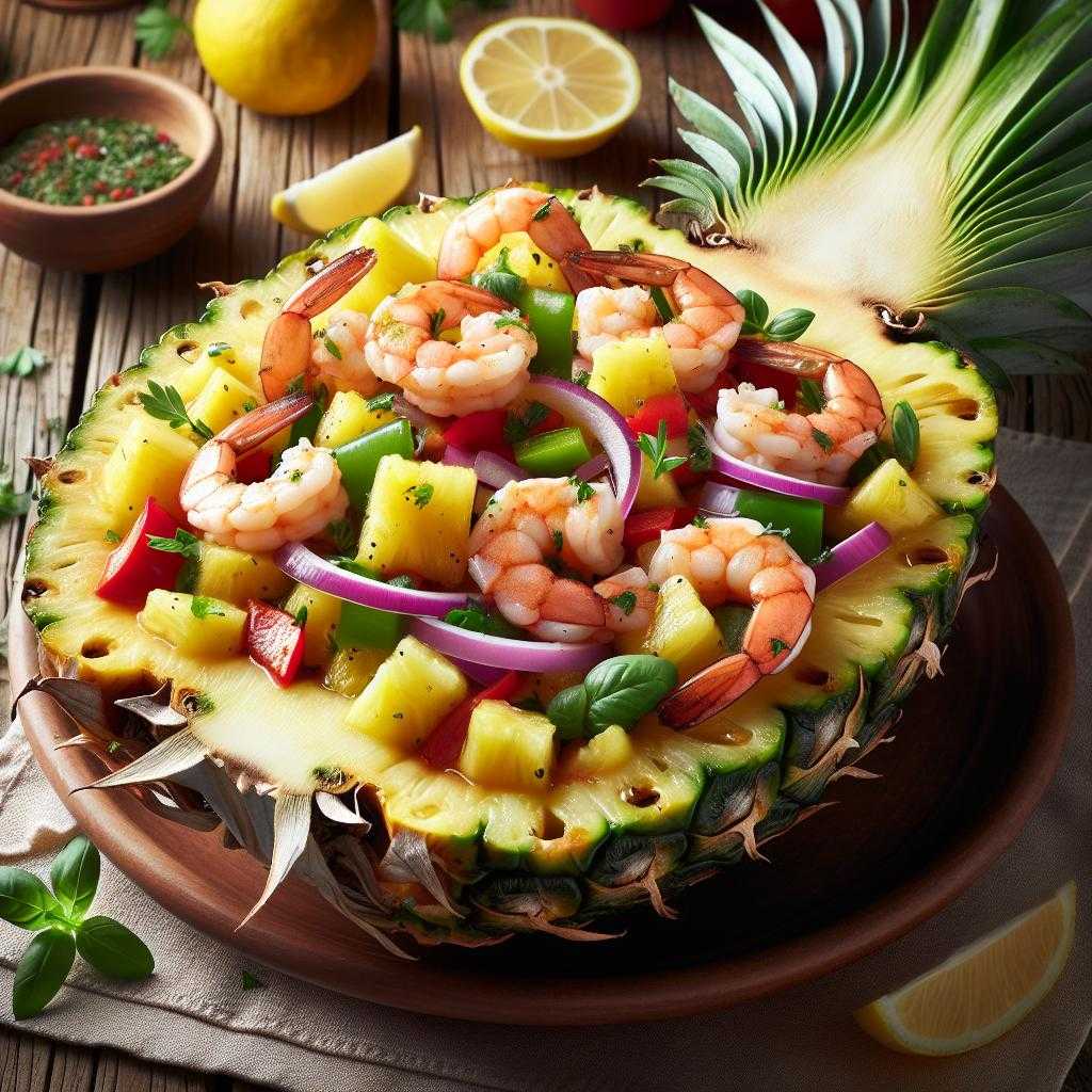 Servire un piatto all’interno dell’ananas è un’abitudine che si trova in diverse cucine tropicali. Oltre all’effetto visivo, il sapore dolce dell’ananas si abbina molto bene con la freschezza dei gamberi e la cremosità dell’avocado.