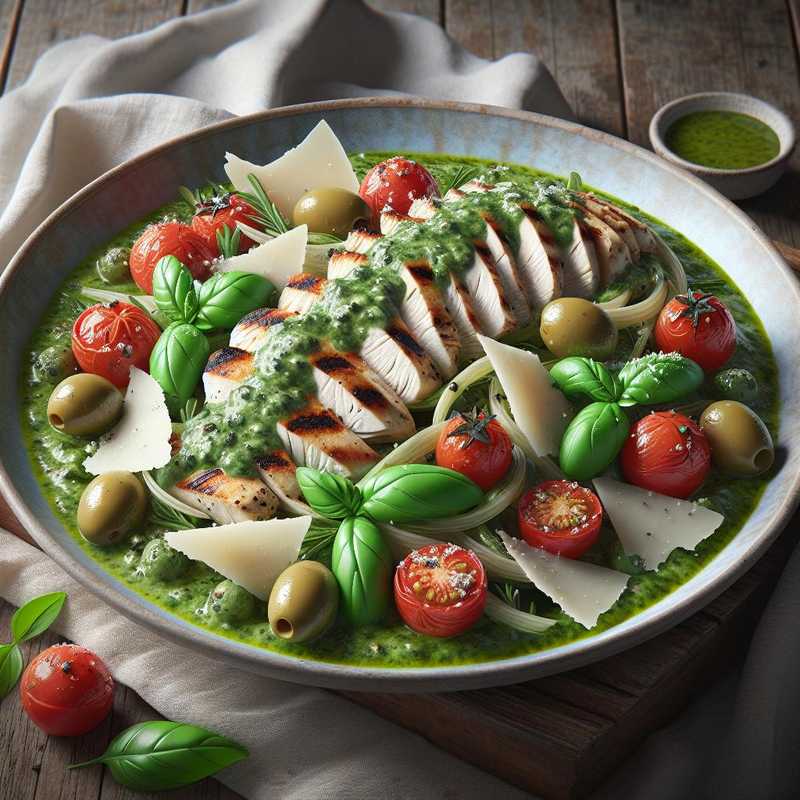 L’insalata di pollo è un piatto versatile e salutare, spesso apprezzato nelle giornate calde. L’aggiunta della salsa di basilico, una variante del classico pesto genovese, arricchisce il piatto con un gusto fresco e aromatico tipico della cucina italiana.